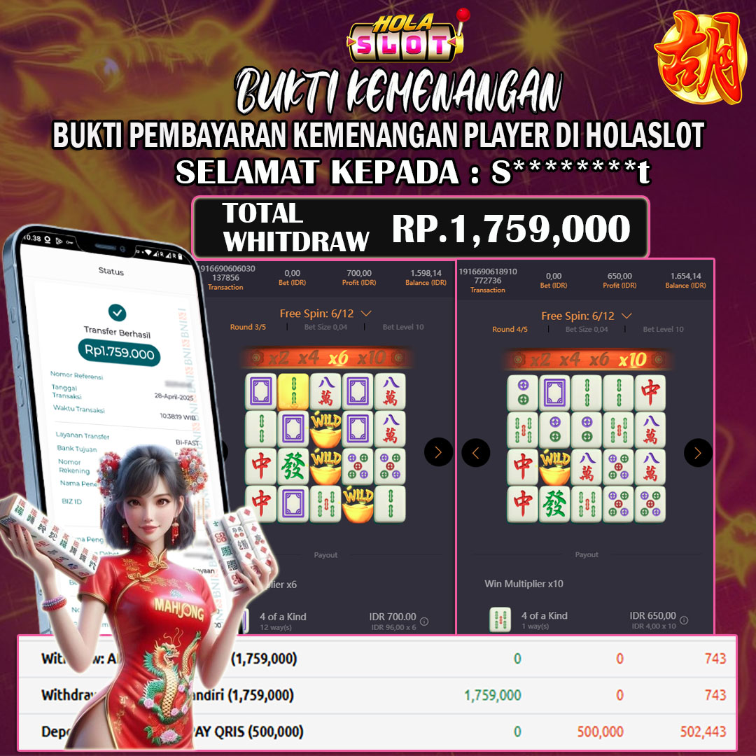 Selamat datang di halaman testimoni kemenangan HOLASLOT, tempat di mana para pemain berbagi kisah nyata tentang keberuntungan mereka! Tidak hanya seru, tetapi setiap putaran di HOLASLOT bisa menjadi awal dari kemenangan besar Anda. Selain itu, beragam bonus dan jackpot fantastis siap menanti Anda setiap harinya. Karena itu, jangan ragu untuk mencoba peruntungan Anda bersama ribuan pemain lainnya yang sudah lebih dulu merasakan sensasi menang. Yuk, mainkan slot favoritmu sekarang dan buktikan sendiri mengapa HOLASLOT menjadi pilihan utama pecinta slot online di Indonesia.