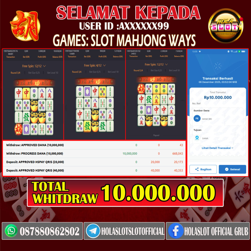 JACKPOT SLOT MAHJONG WAYS 06 DESEMBER 2025, Jackpot Slot Gacor, Kemenangan Slot, Bukti Kemenangan Slot, Kemenangan Slot Pragmatic Play, Menang Slot online, Slot Gacor, Situs Aman Terpercaya, WD Berapapun Pasti DI Bayar Tuntas, Maxwin Slot Online.