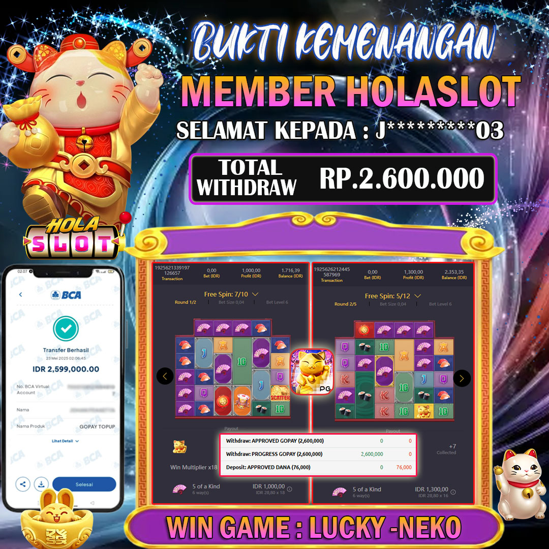 Selama bermain di HOLASLOT, banyak pemain telah meraih kemenangan besar yang dibagikan melalui halaman testimoni kami. Oleh karena itu, testimoni ini menjadi bukti nyata bahwa peluang menang sangat terbuka bagi siapa saja. Selanjutnya, dengan banyaknya promo menarik yang tersedia setiap hari, para pemain memiliki kesempatan lebih besar untuk meraih hasil maksimal. Sementara itu, berbagai bonus seperti cashback, free spin, dan turnamen berhadiah terus diluncurkan untuk menambah keseruan. Sebagai kesimpulan, HOLASLOT bukan hanya tempat bermain game online, tapi juga ladang keberuntungan yang layak Anda coba sekarang juga!.