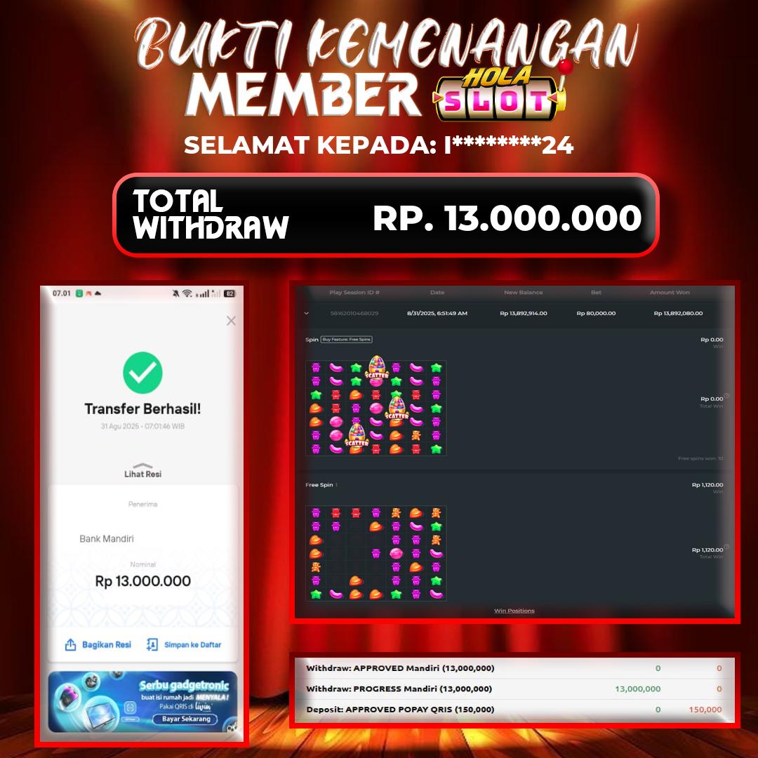 Selama bermain di HOLASLOT, banyak pemain telah meraih kemenangan besar yang dibagikan melalui halaman testimoni kami. Oleh karena itu, testimoni ini menjadi bukti nyata bahwa peluang menang sangat terbuka bagi siapa saja. Selanjutnya, dengan banyaknya promo menarik yang tersedia setiap hari, para pemain memiliki kesempatan lebih besar untuk meraih hasil maksimal. Sementara itu, berbagai bonus seperti cashback, free spin, dan turnamen berhadiah terus diluncurkan untuk menambah keseruan. Sebagai kesimpulan, HOLASLOT bukan hanya tempat bermain game online, tapi juga ladang keberuntungan yang layak Anda coba sekarang juga!.